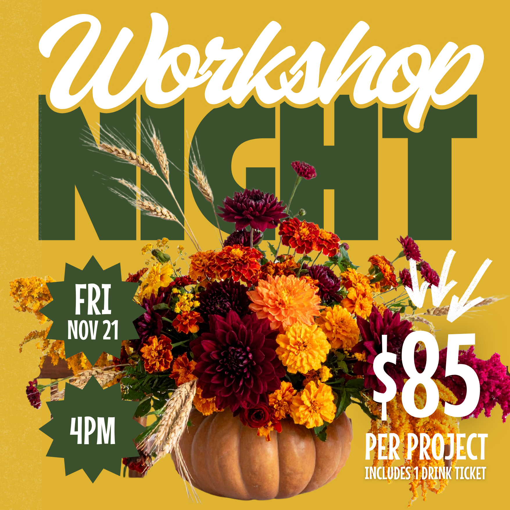 Join Seedy’s Plants after hours at High Octane Coffee for our new monthly Workshop Night—every third Friday! Our kickoff class is Friday, November 21 at 4:00 PM. Create a live floral piece in a pumpkin.