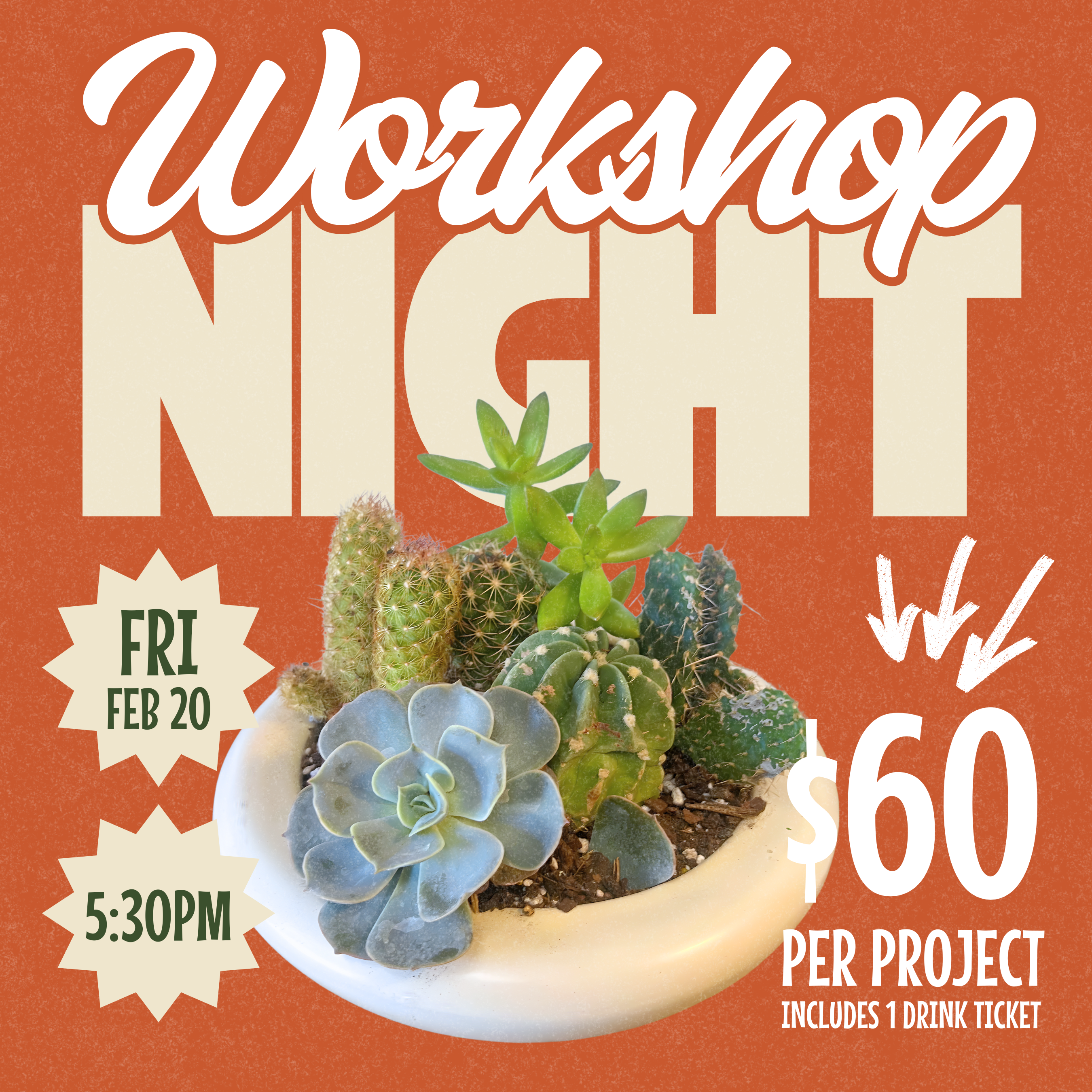 Join us for an evening of fun, drinks, and low-maintenance greenery as we guide you in creating your own Cactus Garden Bowl—a sunny little slice of desert chic for your windowsill, desk, or sunroom.