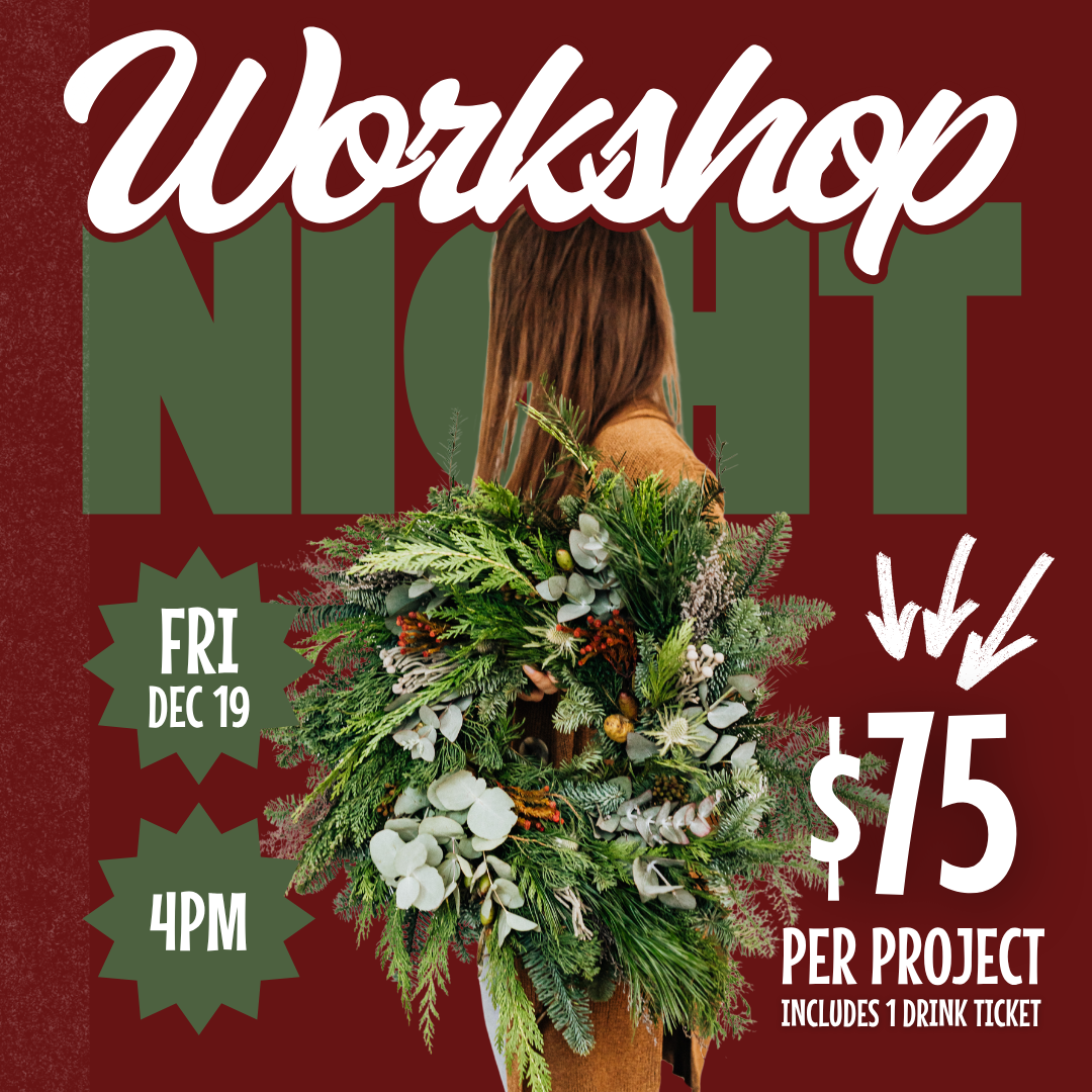 Join Seedy’s Plants for our monthly Workshop Night! This month we’re crafting a live holiday wreath with an upscale, natural look: think fresh-cut evergreens, luxe ribbons, hand-tied bows, and pinecones.