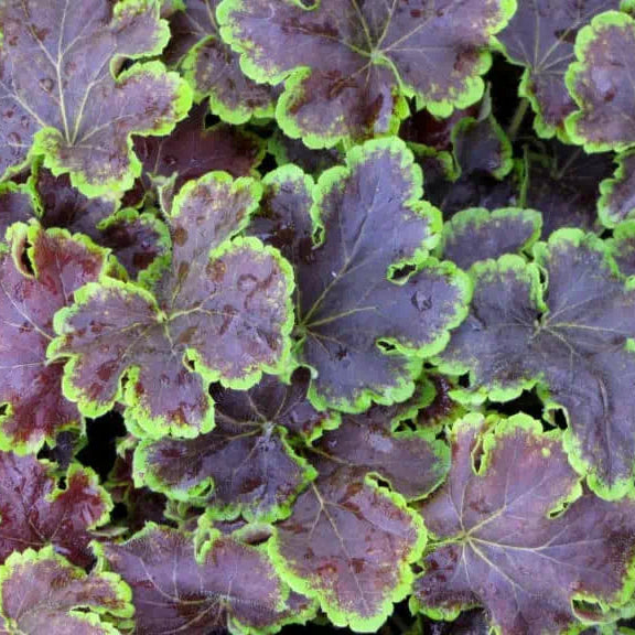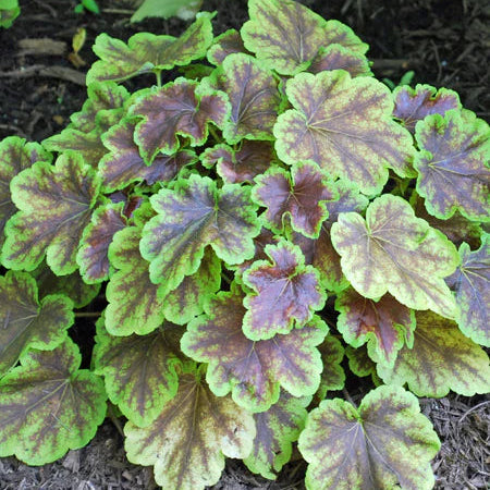 Known for its dramatic foliage, ‘Solar Eclipse’ Heucherella features bold red-brown leaves with striking lime-green edges and scalloped margins. Forming a dense, compact mound, it combines unique color contrast with vigor and resilience. Perfect for shady borders and woodland gardens, it delivers season-long interest, making a big impact in a small space.