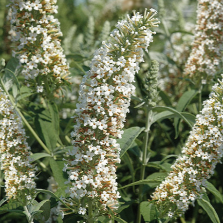 Silver Frost is a compact, fast-growing butterfly bush known for its fragrant, upright white flower spikes and distinctive silver-gray foliage. Blooming continuously from summer through fall, it attracts butterflies, hummingbirds, and bees in droves. With a tidy, mounding habit and silvery aesthetic, it stands out as a bright focal point in pollinator gardens and mixed borders. This cultivar is more compact and upright than other white-flowering varieties, making it an ideal choice for smaller landscapes or modern garden designs.